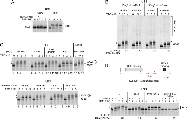 Figure 6. Single-stranded DNA-dependent Xic2 phosphorylation at residues S78/S81 is sensitive to caffeine treatment. A. Phosphorylation shift assay. 35S-methionine labeled Chk2 and Xic2 were incubated in HSS with (+) or without (-) annealed oligonucleotides DNA (dsDNA ends, 100 ng/ul) for 0 to 3 hrs as indicated. B. Xic2 degradation assay. 35S-methionine labeled Xic2 was incubated in LSS with 10 ng/ul or 50 ng/ul ΦX174 single-stranded DNA (ssDNA) in the presence of XB- (buffer) or 10 mM caffeine for 0 to 3 hrs as indicated. The mean percentage of remaining Xic2 from two independent experiments is shown (% Xic2 remaining) where the zero hour time point was normalized to 100%. C. Phosphorylation shift assay. 35S-methionine labeled Xic2 was incubated in LSS or HSS as indicated with ΦX174 (ssDNA), XB- (Buffer), nicked pCS2+ plasmid DNA (nicked dsDNA), XSC, UV-irradiated plasmid DNA (UV DNA), uncut plasmid DNA (Uncut), HindIII linearized plasmid DNA (HindIII), StuI linearized plasmid DNA (StuI), or Asp718 linearized plasmid DNA (Asp718) at 10 ng/ul final DNA concentrations for 0 to 3 hrs as indicated. D. Xic2 degradation assay. Top panel: Schematic representation of Xic2 with potential S/T-P and S/T/-Q phosphorylation sites and the proximal sequences surrounding the S/T-Q sites of Xic2. Bottom panel: 35S-methionine labeled Xic2 wildtype (WT) or mutants (S98A, S78A/S81A, or S78A/S81A/S98A) were incubated in LSS with (+) or without (-) 10 ng/ul ΦX174 single-stranded DNA (ssDNA) for 0 to 3 hrs as indicated. The mean percentage of remaining Xic2 from two independent experiments is shown (% Xic2 remaining) where the zero hour time point was normalized to 100%. In all figures, the caret (<) and asterisks (*) indicate the slower migrating phosphoforms of Xic2 and phosphorylated Xic2 is also indicated as XIC2-P.