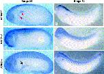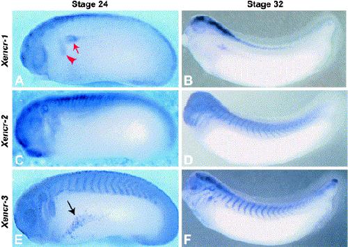 Fig. 4. Later expression of Xencr-1, Xencr-2, and Xencr-3. (AâF) Lateral view, anterior to the left. (A) Xencr-1, st. 24 (B) Xencr-1, st. 32. (C) Xencr-2, st. 24. (D) Xencr-2, st. 32. (E) Xencr-3, st. 24. (F) Xencr-3, st. 32. (AâB) Xencr-1 shows expression in the dorsal neural tube, optic vesicle, migrating branchial arch neural crest cells (red arrowhead), pronephric anlage (red arrow), and faint staining in the liver. (CâD) Xencr-2 shows expression in the neural tube, cement gland, optic vesicle, otic vesicle, branchial arches, somites, and faint staining in the lateral line placodes. (EâF) Xencr-3 shows continued expression in the dorsal neural tube, lens placode, otic vesicle, lateral lines, branchial arch and hyoid neural crest streams, somites, and dorsal fin. A transient expression in the lateral plate (black arrow) is seen during early tailbud stages but is downregulated by st. 32.