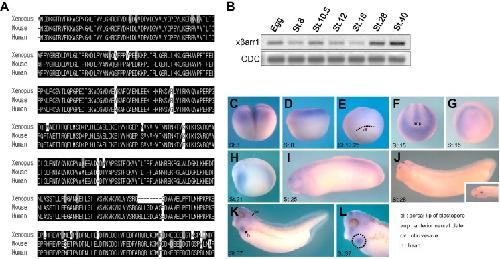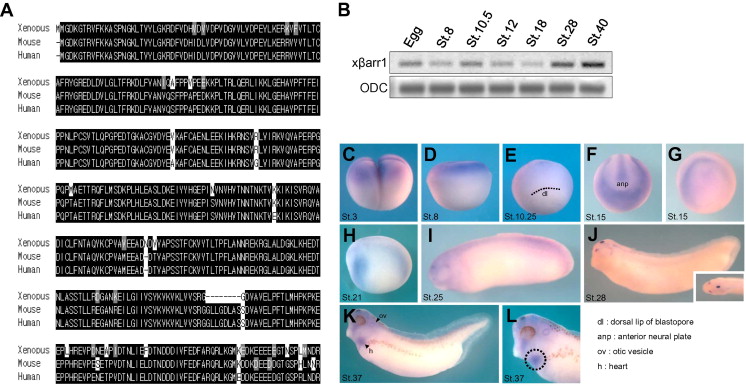 Fig. 1. Expression pattern of xbarr1 in Xenopus early development. (A) Amino acid sequence comparison of Xenopus b-arrestin 1 and its homologues identified in human and