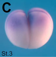 arrb1 (arrestin, beta 1) gene expression in Xenopus laevis embryo, assayed via in situ hybridization, NF stage 3, horizontal view, animal up.