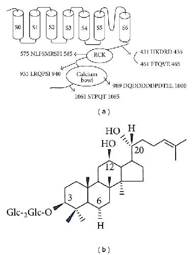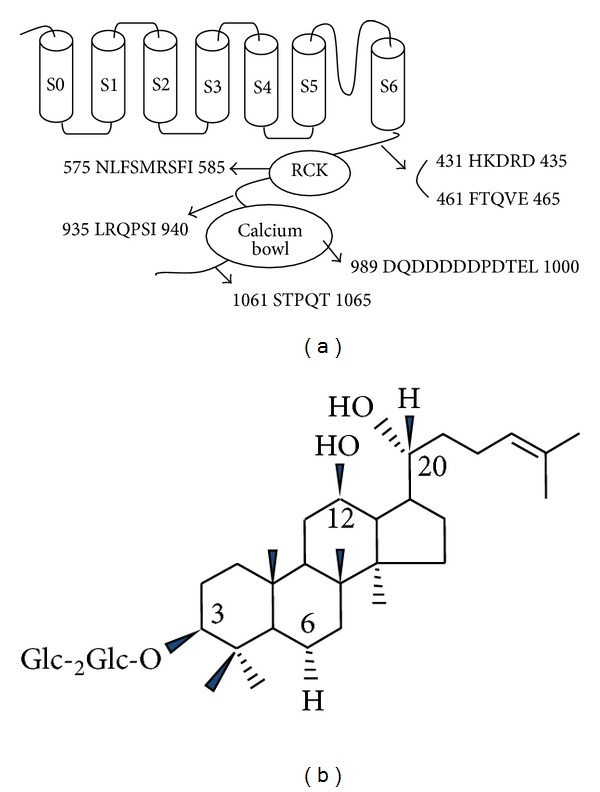 Figure 1. The primary amino acid sequence of the mutated BKCa channel α subunit and the chemical structure of ginsenoside Rg3. (a) The brief sequence alignment of the BKCa channel and the mutated amino acid residues in the CaM kinase II phosphorylation sites (462, 512), PKA (939), PKC (1061), or Ca2+ binding sites of the Ca2+ bowl (989, 991, 992, 993, 994, 995) and RCK domains (433, 579). (b) The chemical structure of ginsenoside Rg3. Glc: glucose.
