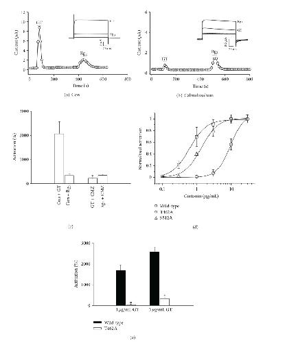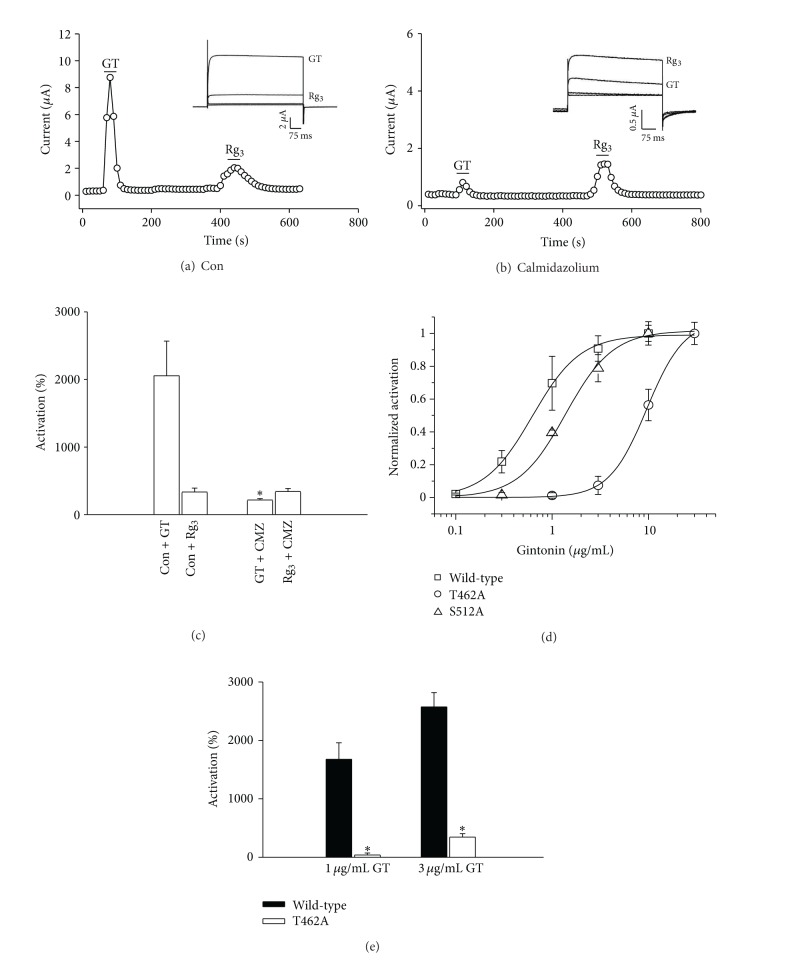 Figure 5. Involvement of calmodulin and CaM kinase II in gintonin-mediated BKCa channel activation. ((a) and (b)) Oocytes expressing the BKCa channel were incubated in the absence (a) or presence (b) of calmidazolium (1.5 μM) for 10 min. Insets, the representative gintonin-mediated or ginsenoside Rg3-mediated peak outward current amplitude at +40 mV from a holding potential of −80 mV was measured in the absence or presence of calmidazolium. (c) Summary histograms show peak outward BKCa channel currents recorded in oocytes expressing the BKCa channel in the absence or presence of the calmidazolium (CMZ) (mean ± S.E.M; n = 13-14 oocytes each; *P < 0.001, compared to gintonin alone). (d) The oocytes expressing mutant BKCa channel at the CaM kinase II phosphorylation site (T462A or S521A) were treated with gintonin by bathing application for 60 s. Mutation of CaM kinase II phosphorylation sites resulted in a rightward shift of the gintonin concentration-response curve (mean ± S.E.M; n = 10–12 oocytes each). (e) Summary histograms show that the gintonin-mediated peak outward BKCa channel currents recorded in oocytes expressing mutant BKCa channel at the CaM kinase II phosphorylation site (T462A or S521A) were significantly attenuated (mean ± S.E.M; n = 10–12 oocytes each; *P < 0.001, compared to wild-type).