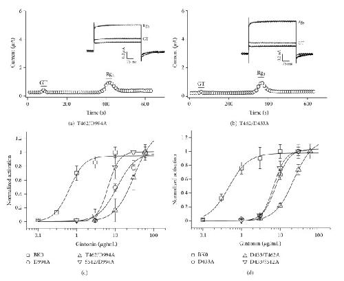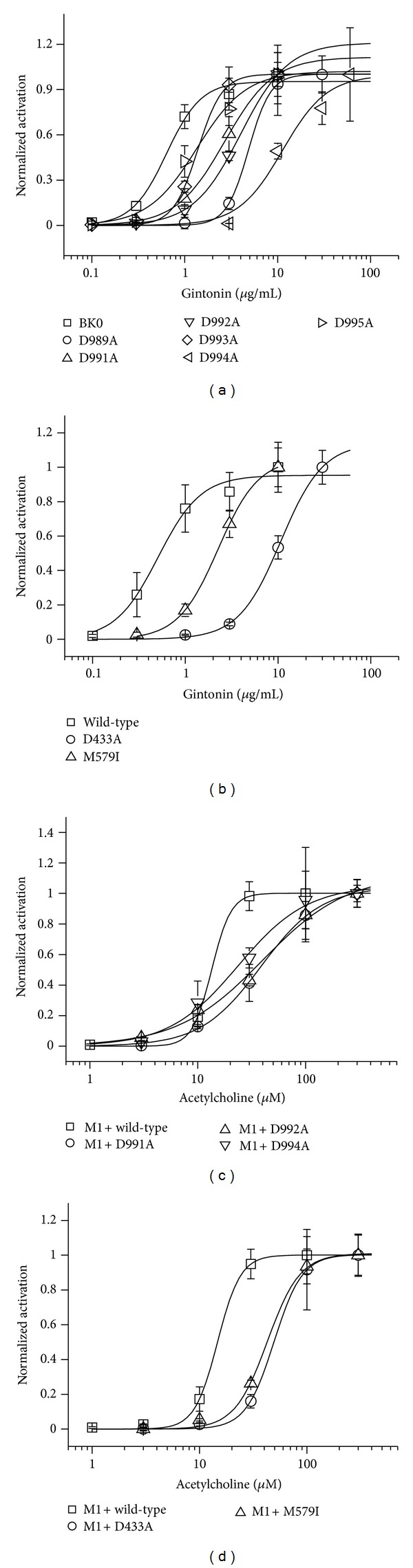 Figure 6. Involvement of the Ca2+ bowl and RCK domain in gintonin-mediated BKCa channel activation. (a) The oocytes expressing wild-type or various mutant BKCa channels at the Ca2+ bowl were treated by bath application of gintonin (10 μg/mL) for 60 s, and peak outward currents were recorded. Mutations of the Ca2+ bowl caused a rightward shift of the gintonin concentration-response curve. (b) The oocytes expressing wild-type or RCK domain mutant BKCa channels, D433A or M579I, were treated with gintonin by bathing application for 60 s. Mutation of the RCK domain also caused a rightward shift of the gintonin concentration-response curve. (c) The oocytes coexpressing M1 muscarinic receptor or various mutant BKCa channels with M1 muscarinic receptor were treated by bath application of acetylcholine (100 μM), and peak outward currents were recorded. Mutations of the calcium bowl caused a rightward shift of the acetylcholine concentration-response curve. (d) Oocytes coexpressing wild-type with M1 muscarinic receptor or mutant BKCa channels at the RCK domain such as D433A or M579I with M1 muscarinic receptor were treated with gintonin by bathing application for 60 s. Mutations in the RCK domain caused a rightward shift of the gintonin concentration-response curve (mean ± S.E.M; n = 13-14 oocytes each).