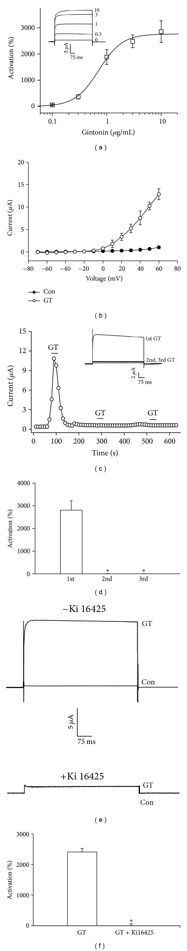 Figure 2. Effects of gintonin on BKCa channel activity. (a) Gintonin concentration-response curve (mean ± S.E.M; n = 13–15 oocytes each). Inset, the representative traces of gintonin-mediated BKCa channel activation at various concentrations. (b) Effects of gintonin (10 μg/mL) on the current-voltage (I-V) relationship of the wild-type BKCa channel (mean ± S.E.M; n = 13–15 oocytes each). (c) Time-current relationship plotted against time before and after repeated applications of gintonin (10 μg/mL) for 30 s in oocytes expressing the BKCa channel. Inset, the representative peak outward current amplitude at +40 mV from a holding potential of −80 mV was measured in the absence or presence of gintonin. (d) Summary histograms show that repeated application of gintonin induces the desensitization of gintonin-mediated BKCa channel activation (*P < 0.001, compared to 1st gintonin treatment). (e) The representative traces on blockage of gintonin-mediated BKCa channel activation by the LPA1/3 receptor antagonist, Ki16425. (f) Summary histograms show that gintonin-mediated activation of the BKCa channel is blocked by the LPA1/3 receptor antagonist, Ki16425 (mean ± S.E.M; n = 12–14 each) (*P < 0.001, compared to gintonin alone).
