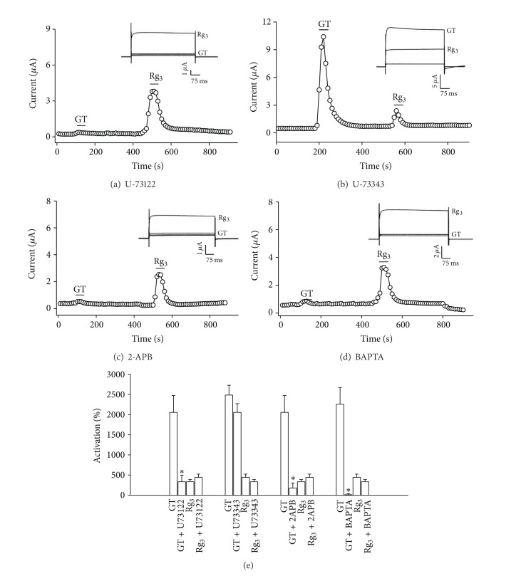 Figure 3. The signal transduction pathways in gintonin-mediated BKCa channel activation. ((a) and (b)) Time-current relationship following application of gintonin (10 μg/mL) or ginsenoside Rg3 (100 μM) for 30 s in the presence of U73122, an active PLC inhibitor, or U73343, an inactive PLC inhibitor, in oocytes expressing BKCa channels. Inset, the representative peak outward current amplitude at +40 mV from a holding potential of −80 mV was measured in the presence of gintonin or ginsenoside Rg3. The active or inactive PLC inhibitor was pretreated for 5 min before gintonin or ginsenoside Rg3 application. ((c) and (d)) Time-current relationship after application of gintonin (10 μg/mL) or ginsenoside Rg3 (100 μM) for 30 s in the presence of 2-APB, an IP3 receptor antagonist, or BAPTA, an intracellular Ca2+ chelator, in oocytes expressing BKCa channels. Inset, the representative peak outward current amplitude at +40 mV from a holding potential of −80 mV was measured in the presence of gintonin or ginsenoside Rg3. The application of 2-APB or BAPTA preceded the gintonin application by 2 h. (e) Summary histograms show the peak outward BKCa channel currents (mean ± S.E.M; n = 13-14 oocytes each) recorded in oocytes expressing the BKCa channel in the absence or presence of the indicated agents. (*P < 0.001, compared to gintonin alone).