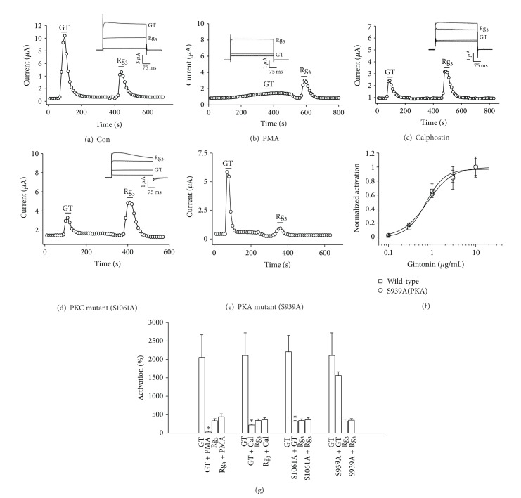Figure 4. Involvement of PKC but not PKA in gintonin-mediated BKCa channel activation. (a) Gintonin or ginsenoside Rg3 induces activation of BKCa channels in oocytes. ((b)–(d)) Time-current relationships show the effects of gintonin or ginsenoside Rg3 in the pretreatment of PMA (1 μM) for 10 min, calphostin (Cal 1.5 μM) for 10 min, or the mutation of the PKC phosphorylation site (S1061A). Peak outward currents were recorded during bath application of gintonin (10 μg/mL). Insets, the representative gintonin-mediated or ginsenoside Rg3-mediated peak outward current amplitude at +40 mV from a holding potential of −80 mV was measured in the presence of PMA, calphostin, or mutant BKCa channels. (e) Time-current relationships following the application of gintonin (10 μg/mL) or ginsenoside Rg3 (100 μM) for 30 s in oocytes expressing S939A mutant BKCa channels. (f) Concentration dependency of wild-type and S939A mutant BKCa channels on gintonin-mediated BKCa channel activation. (g) Summary histograms show that peak outward BKCa channel currents (mean ± S.E.M; n = 11-12 oocytes each) recorded in oocytes expressing the BKCa channel in the absence or presence of the indicated agents or mutation (*P < 0.001, compared to gintonin alone).