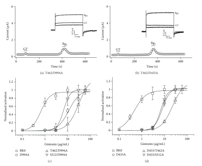 Figure 7. Double mutations of CaM kinase II and Ca2+ bowl or RCK domain further attenuate gintonin-mediated BKCa channel activation. (a) Time-current relationship after application of gintonin (10 μg/mL) or ginsenoside Rg3 (100 μM) for 60 s in oocytes coexpressing BKCa channels and CaM kinase II + Ca2+ bowl mutants. Insets, the representative peak outward current amplitude at +40 mV from a holding potential of −80 mV was measured in the presence of gintonin or ginsenoside Rg3. (b) Time-current relationship after application of gintonin (10 μg/mL) or ginsenoside Rg3 (100 μM) for 60 s in oocytes coexpressing BKCa channels and CaM kinase II + RCK domain mutants. Inset, the representative peak outward current amplitude at +40 mV from a holding potential of −80 mV was measured in the presence of gintonin or ginsenoside Rg3. (c) Coexpression of BKCa channels with CaM kinase II + Ca2+ bowl mutants caused a further rightward shift of the gintonin concentration-response curve. (d) Coexpression of BKCa channels with CaM kinase II + RCK domain mutants caused a further rightward shift of the gintonin concentration-response curve (mean ± S.E.M; n = 13 oocytes each).