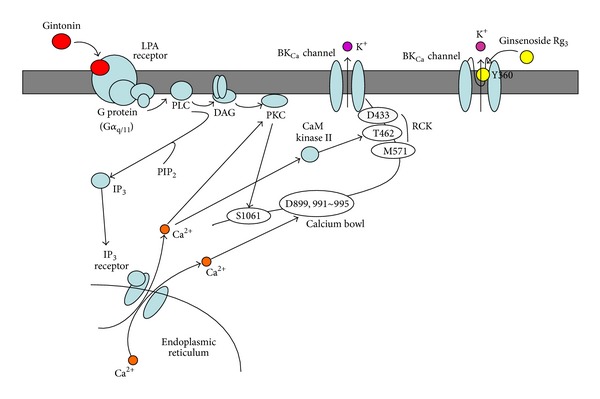 Figure 8. A comparative drawing of the action modes between gintonin and ginsenoside Rg3 in BKCa channel activation. Gintonin activates BKCa channels via G protein-coupled LPA1 receptors. Gintonin-mediated BKCa channel activations are mediated by Ca2+ binding to the Ca2+ bowl, RCK, or via activations of Ca2+-dependent kinases, whereas ginsenoside Rg3 activates BKCa channels through direct interaction with a specific amino acid located at the pore entryway of channel proteins following depolarization but not receptor activation [24].