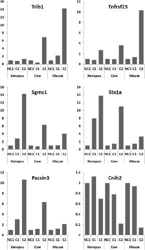 Figure 4. Expression profiles of specific orthologous genes in Xenopus, mouse, and cow. The microarray expression profiles of specific gene in the somatic cells surrounding the oocyte during competence acquisition are shown. The mean expression is shown for the following: developmentally incompetent or poorly competent prophase I oocytes (NC1), developmentally competent prophase I oocytes (C1), and developmentally competent metaphase II oocytes (C2).