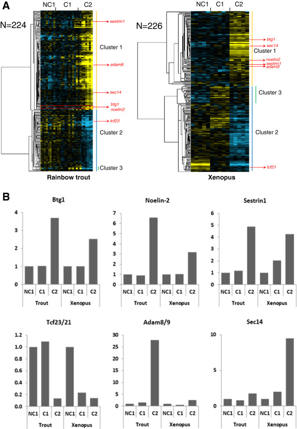 Figure 1. Differentially expressed orthologous genes exhibiting a conserved expression profile in rainbow trout and Xenopus. (A) Supervised clustering of expression profiles in the somatic layers of the ovarian follicle in rainbow trout and Xenopus during oocyte developmental competence acquisition: developmentally incompetent or poorly competent prophase I oocytes (NC1), developmentally competent prophase I oocytes (C1), and developmentally competent metaphase II oocytes (C2). For each species, the number of differentially expressed orthologous genes is indicated. (B) The expression profiles of specific genes are shown.