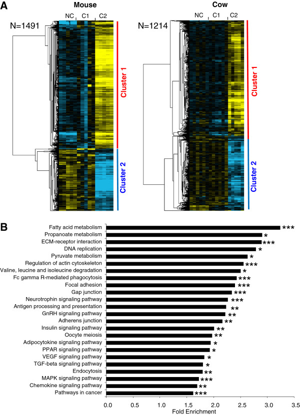 Figure 2. Differentially expressed orthologous genes exhibiting a conserved expression profile in mouse and cow. (A) Supervised clustering of expression profiles in the somatic layers of the ovarian follicle in mouse and cow species during oocyte developmental competence acquisition: developmentally incompetent or poorly competent prophase I oocytes (NC1), developmentally competent prophase I oocytes (C1), and developmentally competent metaphase II oocytes (C2). For each species, the number of differentially expressed orthologous genes is indicated. (B) Gene ontology and KEGG pathways enrichment score in clusters 1 and 2. Stars denote the p-values: * p<0.05; ** p<0.01; *** p<0.001.