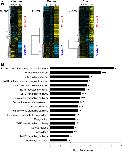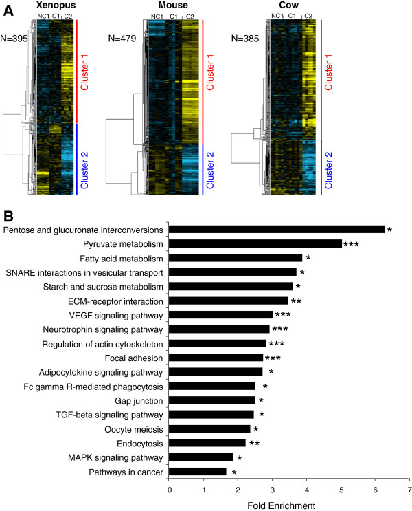 Figure 3. Differentially expressed orthologous genes exhibiting a conserved expression profile in Xenopus, mouse, and cow. (A) Supervised clustering of expression profiles in the somatic layers of the ovarian follicle in Xenopus, mouse, and cow species during oocyte developmental competence acquisition: developmentally incompetent or poorly competent prophase I oocytes (NC1), developmentally competent prophase I oocytes (C1), and developmentally competent metaphase II oocytes (C2). For each species, the number of differentially expressed orthologous genes is indicated. (B) Gene ontology and KEGG pathways enrichment score. Stars denote the p-values: * p<0.05; ** p<0.01; *** p<0.001.