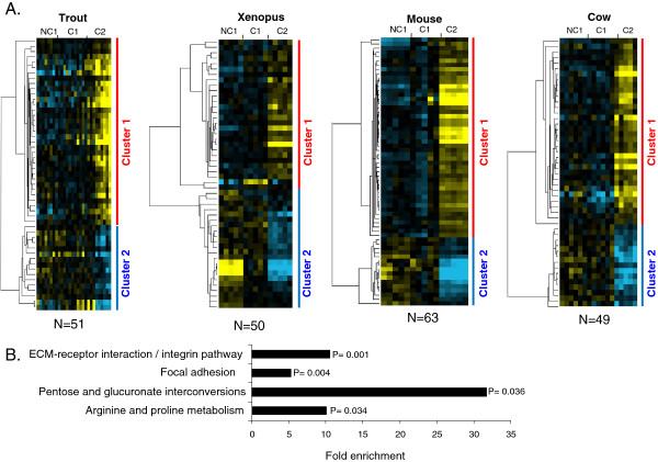 Figure 5. Differentially expressed orthologous genes exhibiting a conserved expression profile in rainbow trout, Xenopus, mouse, and cow. A. Supervised clustering of expression profiles in the somatic layers of the ovarian follicle in rainbow trout, Xenopus, mouse, and cow species during oocyte developmental competence acquisition: developmentally incompetent or poorly competent prophase I oocytes (NC1), developmentally competent prophase I oocytes (C1), and developmentally competent metaphase II oocytes (C2). For each species, the number of differentially expressed orthologous genes is indicated. B. Gene ontology enrichment score in clusters 1 and 2 (p<0.05).