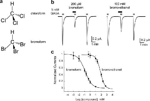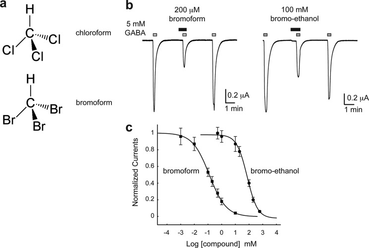 a, chemical formulas of chloroform and bromoform. b, ELIC current traces were evoked by application of 5 mm GABA in the absence and presence of 200 μm bromoform or 100 mm bromoethanol. c, concentration-inhibition curves from the experiments shown in panel b. Squares are data for bromoform, and circles are data for bromoethanol (mean ± S.E.). Each data point represents the average of 3–10 experiments.