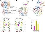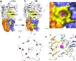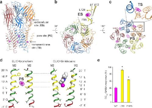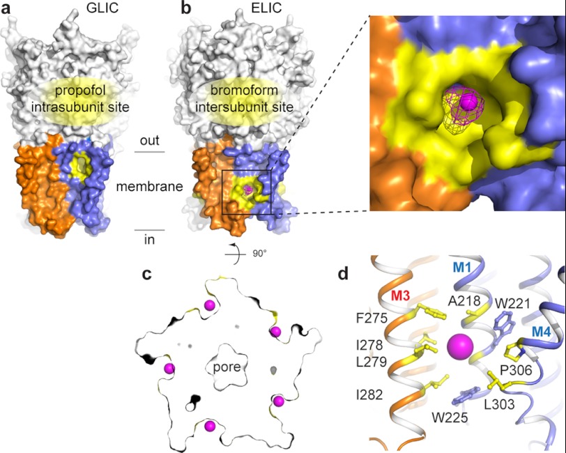a and b, Comparison of the propofol binding site in GLIC (a) and the bromoform binding site of ELIC (b) in a surface representation. Propofol binds in an intrasubunit pocket in the upper half of the transmembrane domain. Bromoform binds in an intersubunit pocket farther down the transmembrane domain. The transmembrane domains of two neighboring subunits are shown in orange and blue. The propofol and bromoform pockets are highlighted in yellow. The extracellular domain is shown in white. The inset shows a more detailed view of the intersubunit transmembrane site. The magenta mesh represents anomalous electron density contoured at 4σ. c, cross-section through a surface representation of ELIC. The intersubunit bromoform site is formed at a pre-existing cavity, which is occupied by a bromoform molecule (single bromine atoms are shown as magenta spheres) in all five sites. d, detailed view of the amino acid residues in ELIC that form the intersubunit bromoform site (highlighted in yellow). The site is formed at the interface between M1 and M4 of one subunit (blue) and M3 of the neighboring subunit (orange).