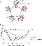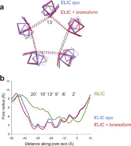 a, ribbon representation of the pore-lining M2-helix in the apoELIC structure (blue, PDB code 2vl0) and the bromoform-bound structure (red). The view is along the five-fold symmetry axis looking down on the channel pore from the extracellular domain. The dashed lines are distance measurements between 13′A Cα atoms of different subunits. b, pore radius analysis for apoELIC (blue), bromoform-bound ELIC (red), and GLIC, which likely corresponds to an open pore conformation (PDB code 3eam).