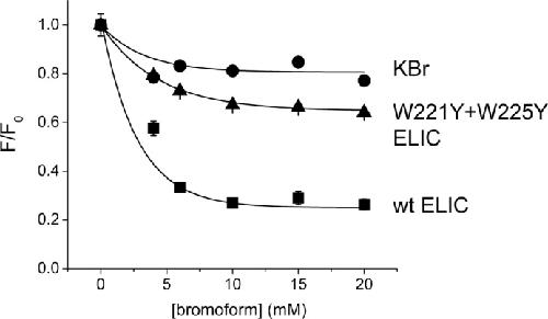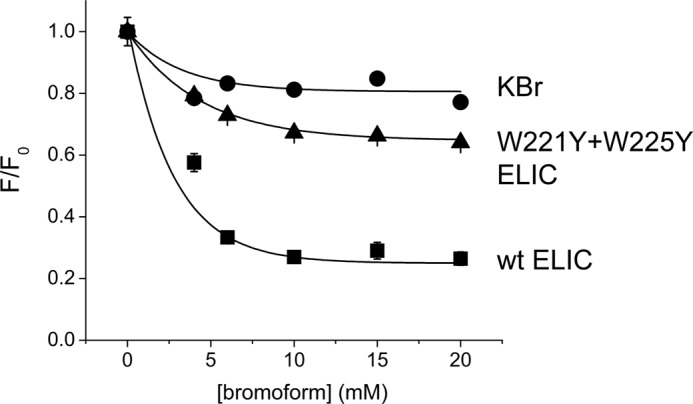 FIGURE 5. Quenching of intrinsic tryptophan fluorescence in ELIC by bromoform. Increasing concentrations of bromoform cause quenching of intrinsic fluorescence in ELIC. This effect is strongly reduced in the double mutant W221Y/W225Y. Each data point is the average of 3 experiments. Error bars indicate S.E.