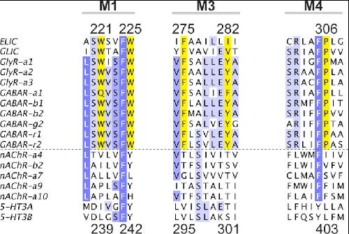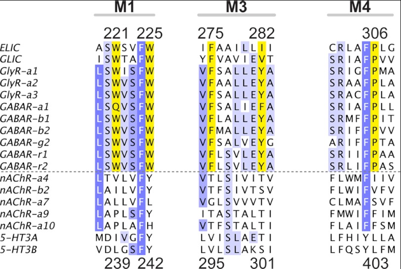 FIGURE 6. Conservation of bromoform binding residues at a transmembrane intersubunit site in pLGICs. Alignment of ELIC, GLIC, and selected sequences of human GlyR, GABAA/CR, nAChR, and 5-HT3Rs is shown. Numbers at the top of the alignment correspond to ELIC residues, and numbers at the bottom correspond to α1 GlyR residues. Residues are colored in shades of blue using an identity threshold of 50%. Yellow residues correspond to the highlighted residues in the intersubunit bromoform site in ELIC (Fig. 3d). Aromatic residues at these positions as well as Pro-307 are strongly conserved in GlyR and GABAA/CR, but not in nAChR and 5-HT3Rs. The dashed line separates inhibitory (top) from excitatory (bottom) receptors.