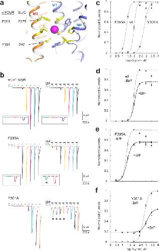 a, graphic representation of the intersubunit bromoform binding site in the transmembrane domain of ELIC. Interacting residues are shown in yellow sticks. The bromoform molecule is shown as a single magenta sphere. b, two-electrode voltage clamp recordings from oocytes expressing wild type α1 GlyRs, F295A, and Y301A mutants. Each current trace is shown in a specific color to facilitate comparison of the range of glycine concentrations: 3 μm (green), 10 μm (red), 30 μm (blue), 100 μm (yellow), 300 μm (magenta), 1 mm (cyan), and 3 mm (black). To reach saturation for Tyr-301 receptors, we also applied 10 mm (orange). Each oocyte was exposed to the same range of glycine concentrations in the presence of 200 μm bromoform (BrF). The insets for WT and F295A show a magnified view of traces obtained at low glycine concentrations. The asterisk indicates potentiation by bromoform. c, concentration-activation curves for WT, F295A, and Y301A GlyRs in the absence of bromoform. d–f, concentration-activation curves in the absence (gray line, −BrF) and presence (black line, +BrF) of 200 μm bromoform for WT (d), F295A (e), and Y301A (f) receptors. Error bars in panels c–f indicate S.E.