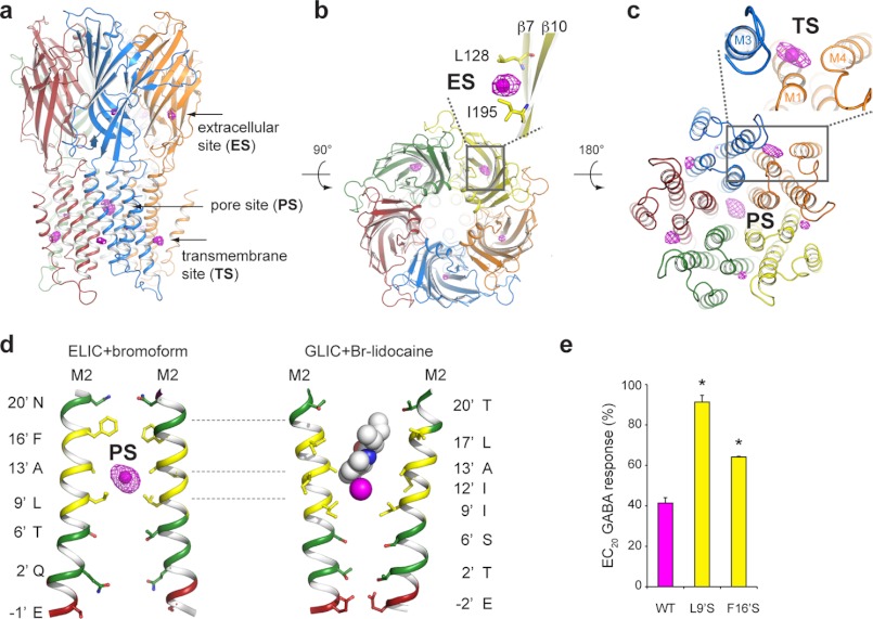 a, side view of ELIC in graphic representation and overlay with anomalous electron density, shown as magenta mesh at a contour level of 4σ. Each subunit of the pentamer is shown in a different color. Anomalous densities can be observed in the extracellular domain, transmembrane domain, and channel pore. b and c, extracellular and intracellular view of ELIC along the five-fold symmetry axis. The pore site is lined by the M2-helices of each of the five subunits. The transmembrane site is formed at the interface between two subunits, involving the M1- and M4-helix of one subunit and the M3-helix of the neighboring subunit. Bromoform molecules are represented as a single magenta sphere. d, comparison of the bromoform binding site in the closed channel pore of ELIC (left) and bromo-lidocaine binding site in the open channel pore of GLIC (right). Bromoform and bromo-lidocaine occupy overlapping binding sites, which are located in the hydrophobic part of the ion conduction pathway (hydrophobic residues are colored in yellow, hydrophilic residues are in green, and charged residues are in red). e, mutagenesis experiments in ELIC demonstrate that the inhibitory effect of 200 μm bromoform is almost completely eliminated in L9′S and strongly reduced in F16′S mutants. The inhibitory effect of bromoform was tested at an EC20 concentration of GABA, which was 0.5 mm for L9′S and 3 mm for wild type and F16′S. Error bars represent mean ± S.E. from 3–5 different experiments. Asterisks indicate significant difference from wild type (p < 0.05).