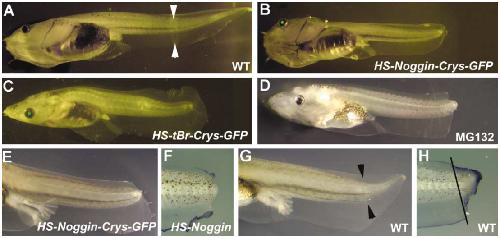 Figure 5. Inhibition of the BMP or Notch Signaling Pathways Prevents Tail RegenerationNontransgenic (A and D) and transgenic F0 tadpoles (B and C) shown 7 days after removal of the posterior 50% of the tail at stage 50/52. (A)�(C) are viewed with both fluorescent and low incident light such that the GFP in the lens can be detected, indicating the presence of the transgene. The tadpoles received a heat shock 3�4 hr before amputation and subsequent daily heat shocks.(A) A wild-type (WT) tadpole can regenerate a complete tail in 7 days. White arrowheads indicate the level of amputation.(B) Transgenic tadpole carrying the HSP70-Noggin-γCrys-GFP construct. Tail regeneration was completely blocked.(C) Transgenic tadpole carrying the HSP70-tBr-γCrys-GFP construct. Tail regeneration was completely blocked.(D) Stage 49 WT tadpole cultured in 10 μM MG132 immediately after removal of the posterior half of the tail, for 7 days. Tail regeneration was completely blocked.(E�H) Regeneration phenotype is linked to inheritance of the transgene in F1 animals derived from crossing a male individual carrying the HSP70-Noggin-γCrys-GFP to a wild-type female. Following heat shocks and amputation, transgenic animals failed to regenerate their tails (E) and Msx1 (blue staining) was not expressed in the stump (F). WT siblings regenerated normally (G), and expressed Msx1 in the blastema (H). Black arrowheads in (G) and a black line in (H) mark the level of amputation.
