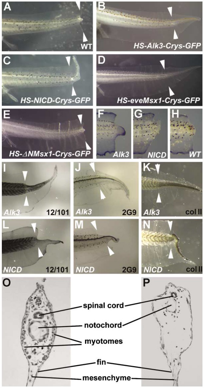 (F) Msx1 is expressed in HSP70-Alk3-γCrys-GFP transgenics.