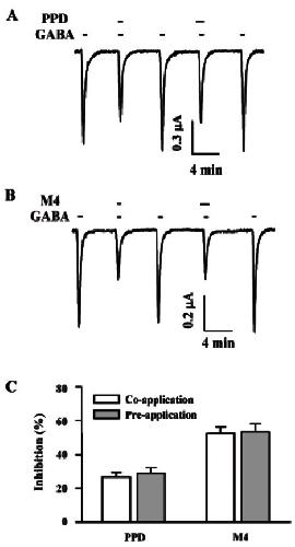 Fig. 2. Effect of M4 and protopanaxadiol (PPD) on γ-aminobutyric acid (GABA)-induced inward peak current (IGABA) in oocytes expressing GABA receptorA (GABAA) receptor. (A) GABA (10 μM) was first applied and then GABA was co- or pre-treated with PPD (100 μM). Co-treatment of PPD with GABA and pre-treatment of PPD before GABA application inhibited IGABA in oocytes expressing α1β1γ2s GABAA receptors. (B) GABA (10 μM) was first applied and then GABA was co- or pre-treated with M4 (100 μM). Thus, co-treatment of M4 with GABA and pre-treatment of M4 before GABA application inhibited IGABA in oocytes expressing α1β1γ2s GABAA receptors. The resting membrane potential of oocytes was about –35 mV and oocytes were voltage-clamped at a holding potential of –80 mV prior to drug application. Traces are representative of 8-12 separate oocytes from three different frogs. (C) Summary of percent inhibition by M4 and PPD of IGABA was calculated from the average of the peak inward current elicited by GABA alone before M4 or PPD and the peak inward current elicited by GABA alone after co- and pre-treatment of M4 or PPD with GABA. Each point represents the mean±SEM (n=9-12 from three different frogs).