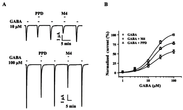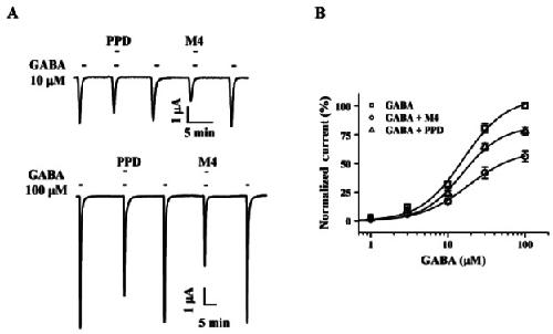 Fig. 5. Concentration-dependent effects of γ-aminobutyric acid (GABA) on M4 or protopanaxadiol (PPD)-mediated inhibition of GABA-induced inward peak current (IGABA). (A) The representative traces were obtained from GABA receptorA (GABAA) receptors expressed in oocytes. IGABA of the upper and lower panels were elicited from concentration of 10 μM and 100 μM GABA at a holding potential of –80 mV, respectively. (B) Concentration- response relationships for GABA in the GABAA receptors applied with GABA (1-100 μM) alone or with GABA plus co-treatment of 100 μM M4 or PPD. The IGABA of oocytes expressing the GABAA receptors was measured using the indicated concentration of GABA in the absence (□) or presence (○) of 100 μM M4 or presence (△) of 100 μM PPD. Oocytes were exposed to GABA alone or to GABA with M4 or PPD. Oocytes were voltage-clamped at a holding potential of –80 mV. Each point represents the mean±SEM (n=8-12/group).