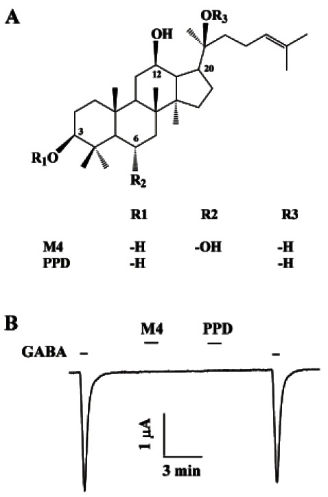 Fig. 1. Chemical structure of the ginsenoside metabolites M4 and protopanaxadiol (PPD) (A) and their effects in oocytes expressing γ-aminobutyric acid (GABA) receptorA (GABAA) receptors. (B) M4 and PPD had no effect on GABA-induced inward peak current in oocytes expressing α1β1γ2s GABAA receptors.
