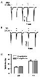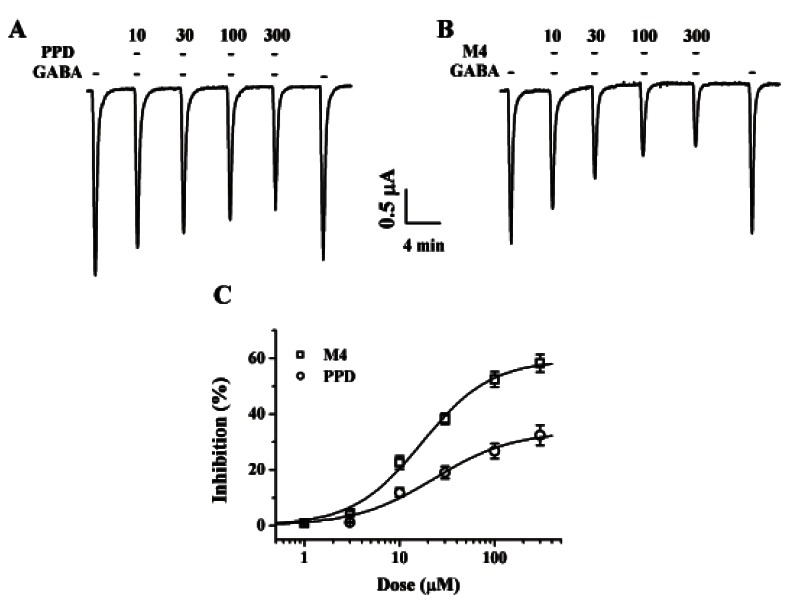 Fig. 3. Concentration-dependent effects of M4 and protopanaxadiol (PPD) on γ-aminobutyric acid (GABA)-induced inward peak current (IGABA) in oocytes expressing GABA receptorA (GABAA) receptors. (A) The trace shows that PPD inhibited the currents elicited by GABA (GABA, 10 μM) in a dose-dependent manner. (B) The trace shows that M4 inhibited the currents elicited by GABA (GABA, 10 μM) in a dose-dependent manner. (C) Percent inhibition by M4 and PPD of IGABA was calculated from the average of the peak inward current elicited by GABA alone before M4 and PPD and the peak inward current elicited by GABA alone after co-treatment of M4 and PPD with GABA. The continuous line shows the curve fitted according to the equation.