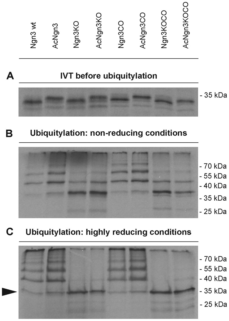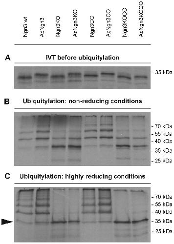 Fig. 2. Ubiquitylation of Ngn3 and mutants on canonical and non-canonical sites.Ubiquitylation assays were performed in interphase Xenopus egg extract using 35S-labeled IVT Ngn3 and mutants as labelled, in the presence of His-tagged ubiquitin (B,C). IVT protein levels were normalised, as demonstrated by the levels of starting material shown in A. Proteins were eluted from NTA-agarose beads using either non-reducing conditions (pHâ 6.8) (B) or highly reducing conditions (pHâ 10, 10% (v/v) β-mercaptoethanol) (C).
