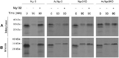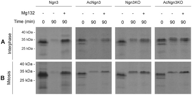 Fig. 4. Forms of Ngn3 lacking lysines are stabilised by Mg132.Degradation assays at a fixed point of 90â minutes were performed in interphase (A) and mitotic (B) Xenopus egg extract using 35S-IVT Ngn3 and mutants thereof, as labelled, in either the presence or absence of 100â µM Mg132 proteasome inhibitor. Samples were run on SDS-PAGE gels, analysed by autoradiography (A,B).