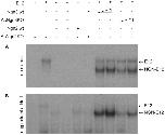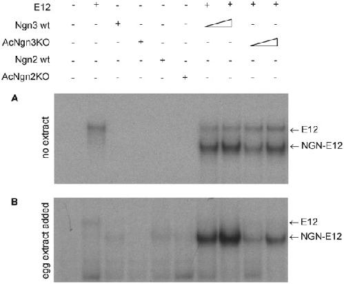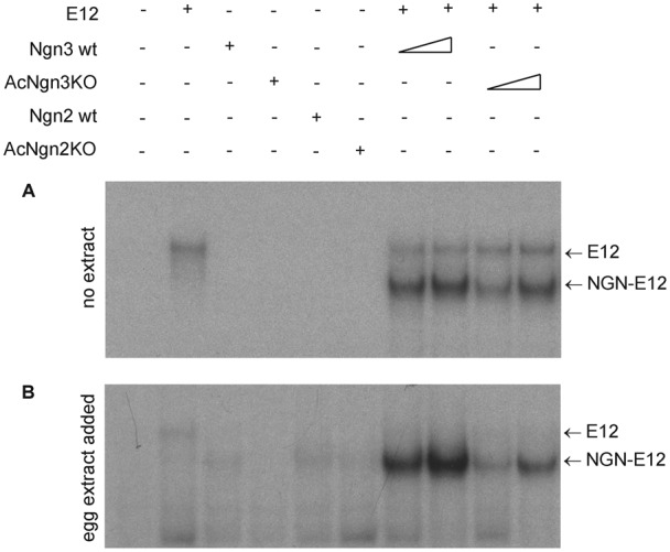 Fig. 6. AcNgn3KO binds DNA less tightly than Ngn3.Ngn3, AcNgn3KO, Ngn2 and AcNgn2KO binding to E box-containing probe, with or without added E protein as indicated, were assayed by EMSA either in buffer alone (A) or in the presence of interphase egg extract (B), triangle representing two different amounts of each IVT (see Materials and Methods).