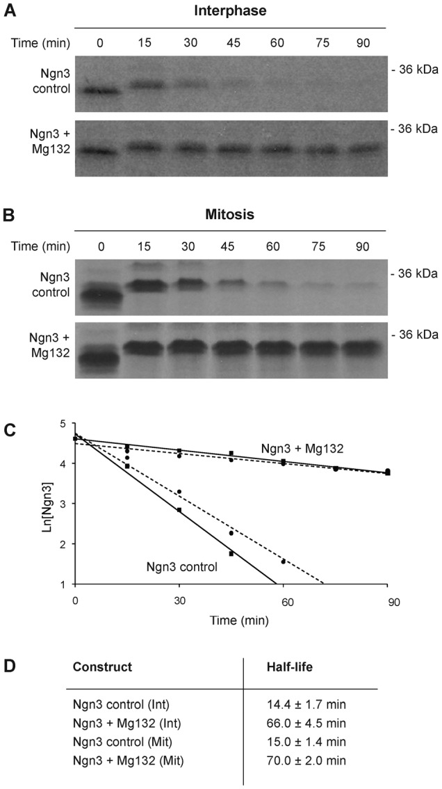 Fig. 1. Ngn3 is degraded by ubiquitin-mediated proteolysis in interphase and mitosis.Degradation assays were performed in interphase (A) and mitotic (B) Xenopus egg extract using 35S-IVT Ngn3 in either the presence or absence of 100â µM Mg132 proteasome inhibitor. Samples were run on SDS-PAGE gels, analysed by autoradiography (A,B) and quantified by phosphorimaging (C). Degradation half-lives were calculated using first-order rate kinetics (D). In C, the solid line shows degradation in interphase extracts, and the dotted line shows degradation in mitotic extracts.