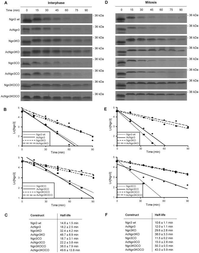 Fig. 3. Identification of Ngn3 ubiquitylation sites involved in degradation.Degradation assays were performed in interphase (A,B,C) and mitotic (D,E,F) Xenopus egg extract using 35S-IVT Ngn3 and mutants (including N-terminal acetylation (Ac), lysine to arginine (KO), and cysteine to alanines (CO) mutations). Samples were run on SDS-PAGE gels, analysed by autoradiography (A,D) and quantified by phosphorimaging (B,E). Degradation half-lives were calculated using first-order rate kinetics (C,F).