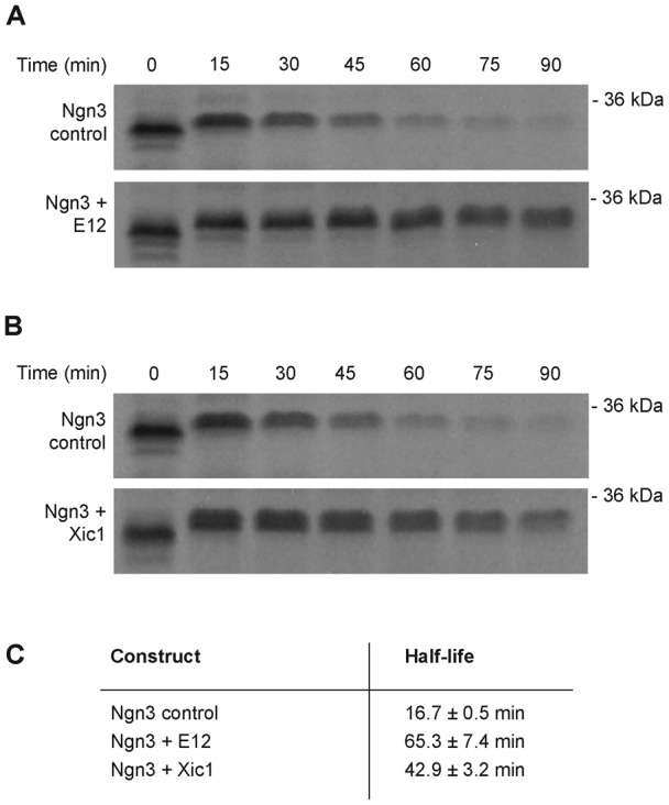 Fig. 5. Ngn3 is stabilised by E12 and Xic1 in interphase Xenopus egg extract.Degradation assays were performed in the presence of either (A) IVT E12 (at a 1:1 volume ratio to Ngn3) or IVT mix alone, or (B) 15â µM Xic1-MBP or 15â µM MBP as a control. Samples were run on SDS-PAGE gels, analysed by autoradiography (A,B) and quantified by phosphorimaging. Degradation half-lives were calculated using first-order rate kinetics (C).
