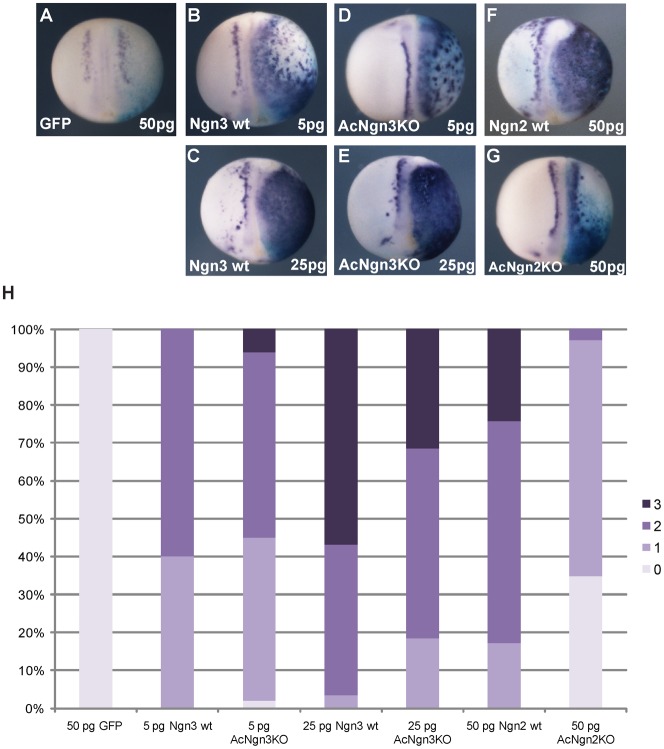 Fig. 7. Ngn3 and AcNgn3KO show similar activity in vivo.1 cell of a 2 cell-stage Xenopus embryo was injected with mRNA encoding GFP (as a control, A), Ngn3 (B,C), AcNgn3KO (D,E), Ngn2 (F) or AcNgn2KO (G) in the amounts as indicated, along with βgal mRNA as a lineage tracer. Expression of neural β tubulin at stage 15 was assayed by in situ hybridisation. A semi-quantitative scoring method for neural β tubulin expression was devised (H), where 0 â=â no ectopic neurogenesis, 1 â=â low levels of ectopic neurogenesis, 2 â=â moderate ectopic neurogenesis and 3 â=â extensive ectopic neurogenesis (number of embryos scored per condition: between 49 and 69).