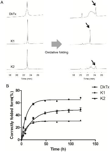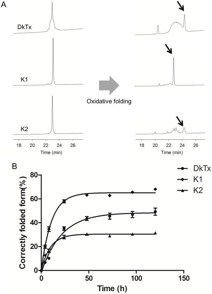 Figure 5. Folding kinetics of K1, K2 and DkTx.(A) HPLC chromatograms showing the folding of DkTx, K1 and K2. The left panel depicts the linear toxins. Arrows indicate correctly folded forms of the toxins. The toxins were eluted with a linear gradient of 5–65% solvent B for 30 min at a flow rate of 1 ml/min, where solvent A was water containing 0.1% TFA and solvent B was acetonitrile containing 0.1% TFA. (B) Comparison of folding kinetics of DkTx, K1 and K2. At each time point, aliquots were withdrawn and acidified by adding acetic acid. Quantification of the folding specifies was accomplished using HPLC. The correctly folded form (%) was determined based on the areas of the HPLC peaks. The curves represent fits of the data to a one-phase association.