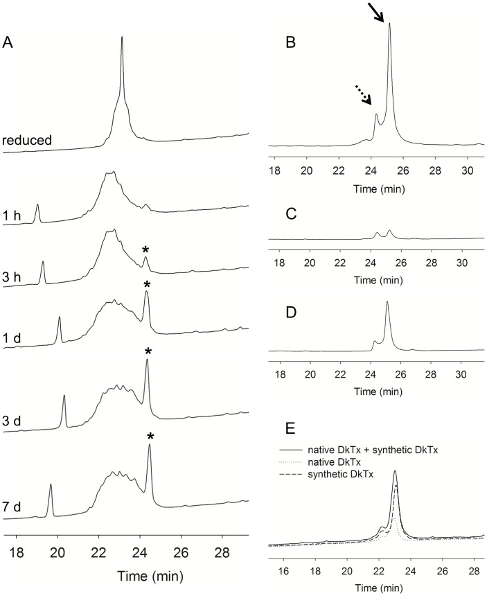 Figure 4. HPLC profiles of DkTx during the folding reaction.The peptides were separated using a linear gradient of 5–65% solvent B for 30 min at a flow rate of 1 ml/min, where solvent A was water containing 0.1% TFA and solvent B was acetonitrile containing 0.1% TFA. (A) Oxidative folding of DkTx in redox buffer was monitored by HPLC. Asterisks indicate correctly folded DkTx. (B) HPLC chromatogram of purified DkTx. Dashed and solid arrows indicate the minor and major forms of DkTx, respectively. (C) The minor form was collected and re-injected after 75 min. (D) The major form was collected and re-injected after 175 min. (E) Co-injection of native and synthetic DkTx.