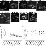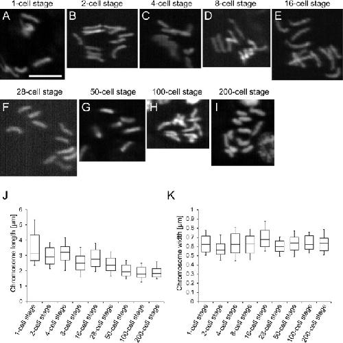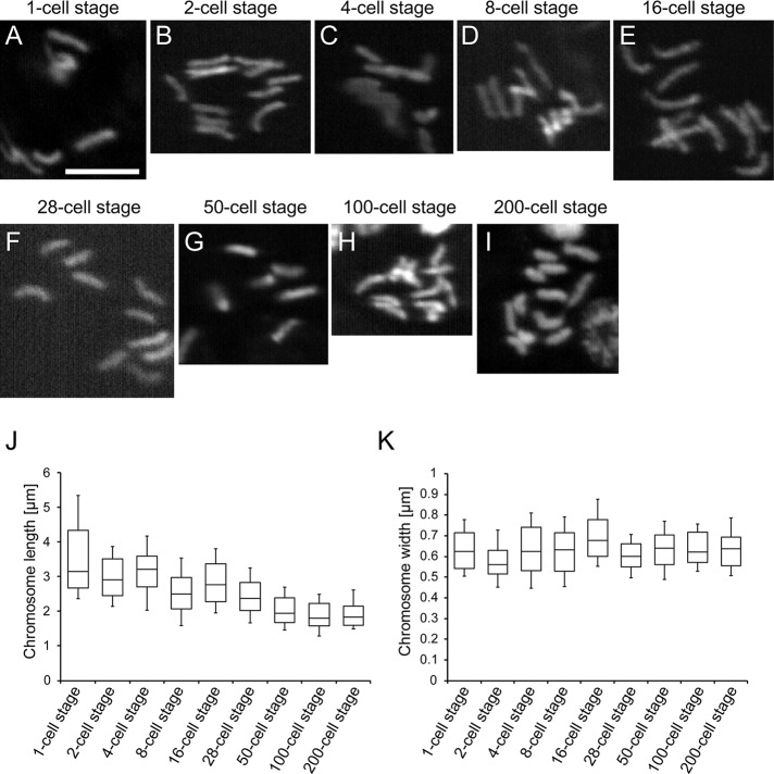 FIGURE 1:. Individual condensed chromosome size is not constant during early embryogenesis. (A–I) Chromosomes in squashed embryos at each cell stage; bar = 5 μm. (J) The lengths and (K) widths of chromosomes at each cell stage are shown in the box plot. The middle line of each box is the median. The top and bottom lines are the third and first quartiles, respectively, and the whiskers indicate the 90th and 10th percentiles. The distributions of chromosome length and width in each cell stage are shown in histograms (Supplemental Figures S1 and S2).