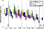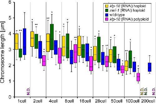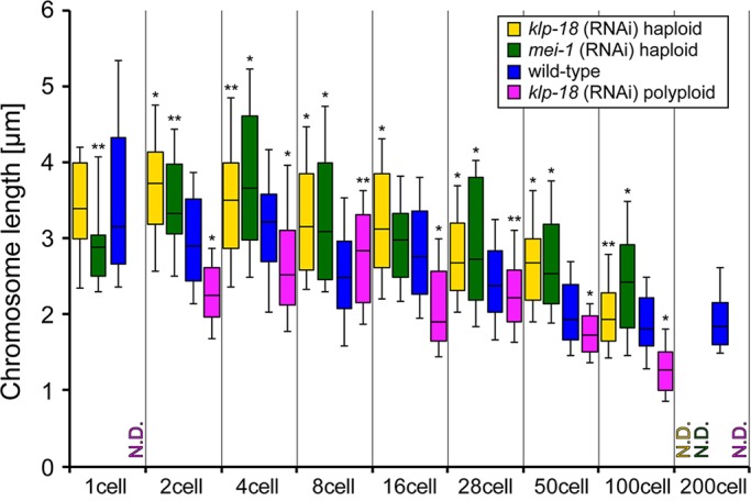 FIGURE 3:. Reduced or increased DNA content leads to increased or reduced condensed chromosome size, respectively. The lengths of condensed chromosomes at each cell stage are shown in the box plot. Data for wild-type (blue), klp-18 (RNAi) haploid (yellow), klp-18 (RNAi) polyploid (pink), and mei-1 (RNAi) haploid (green) embryos. Chromosome lengths at almost all stages, except for the one-cell stage (haploid per pronucleus only at the one-cell stage) in klp-18 (RNAi) haploid or mei-1 (RNAi) haploid embryos, were significantly larger than those of wild-type embryos (Student's t test). *p < 0.005; **0.005 < p < 0.05. The chromosome lengths in klp-18 (RNAi) polyploid embryos were significantly smaller than those of wild-type embryos at each cell stage. Note that the pronuclei contained a haploid genome in wild-type and klp-18 or mei-1 (RNAi) embryos at the one-cell stage. The middle line of each box is the median. The top and bottom lines are the third and first quartiles, respectively, and the whiskers indicate 90th and 10th percentiles. N.D., not determined. Mean length, SD, and sample size are shown in Table 1.