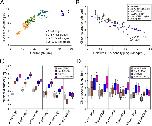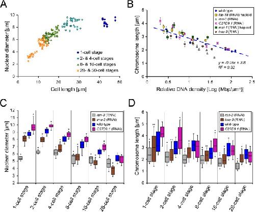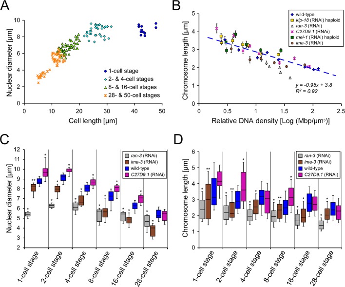 FIGURE 4:. Nucleus size affects condensed chromosome size. (A) Relationship between measured nuclear diameter and cell length at various cell stages of wild-type embryos. Different shapes and colors represent each cell stage: blue circle, 1-cell stage; light blue diamond, 2- and 4-cell stages; green triangle, 8- and 16-cell stages; orange cross, 28- and 50-cell stages. (B) Mean chromosome length at each cell stage was plotted as function of the calculated relative DNA density. Data for wild-type (blue diamond), klp-18 (RNAi) haploid (yellow rectangle), mei-1 (RNAi) haploid (green rectangle), ran-3 (gray triangle), ima-3 (brown circle), and C27D9.1 (RNAi) embryos (pink cross). We do not include data from klp-18 (RNAi) polyploid embryo because the exact ploidy of the embryos could not be determined. The regression line for the wild-type data is shown. Error bars are SE. (C) Individual nuclear diameters for wild-type (blue), ran-3 (gray), ima-3 (brown), and C27D9.1 (RNAi) embryos (pink) at each cell stage are shown in the box plot. The nuclear diameters in each RNAi embryo in all cell stages were significantly different from those of wild-type embryos (Student's t test). (D) Chromosome length at most cell stages in ran-3, ima-3, C27D9.1 (RNAi) embryos significantly differed from those of wild-type embryos (Student's t test). *p < 0.005; **0.005 < p < 0.05. The middle line of each box is the median. The top and bottom lines are the third and first quartiles, respectively, and the whiskers indicate the 90th and 10th percentiles. Mean chromosome length, nuclear diameter, SD, and sample size are shown in Tables 1 and 2.