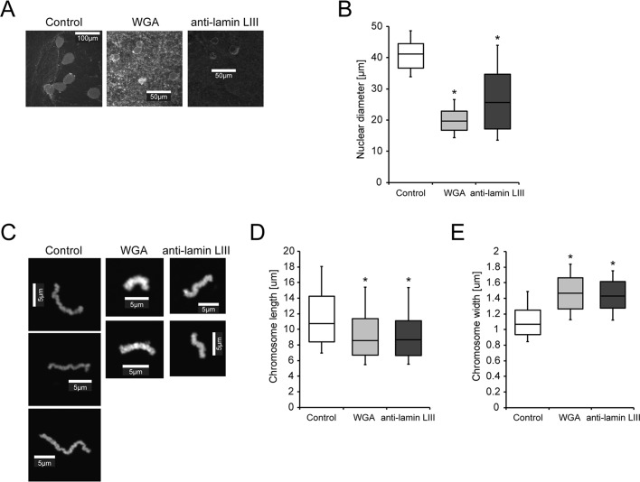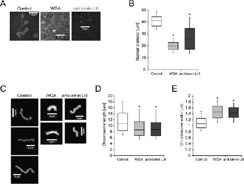 FIGURE 5:. Chromosome sizes reconstructed in vitro using X. laevis egg extracts. (A) Examples of nuclei reconstructed from control extracts, with WGA, or with anti–lamin LIII antibody. (B) Quantified nuclear diameters in the extracts for control, WGA, and anti-lamin LIII antibody. (C) Representative chromosomes reconstituted with the extracts after nuclear formation. (D, E) Length (D) and width (E) of the reconstituted chromosomes. The middle line of each box is the median. The top and bottom lines are the third and first quartiles, respectively, and the whiskers indicate the 90th and 10th percentiles. Mean chromosome length, chromosome width, nuclear diameter, SD, and sample size are shown in Table 3. *p < 0.005.