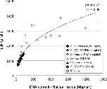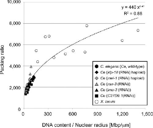 FIGURE 6:. Curve fit of the estimated packing ratio vs. intranuclear DNA density. Linear packing ratio was plotted vs. intranuclear DNA density, which was calculated by dividing DNA content (Mbp) by the nuclear radius (μm). Data are summarized in Supplemental Table S3. The plot was fitted to the exponential curve with the least-squares method. Black circle, C. elegans wild type (diploid); black diamond, C. elegans klp-18 (RNAi) haploid; gray diamond, C. elegans mei-1 (RNAi) haploid; gray triangle, C. elegans ran-3 (RNAi); black triangle, C. elegans ima-3 (RNAi); black square, C. elegans C27D9.1 (RNAi); white circle, X. laevis.