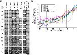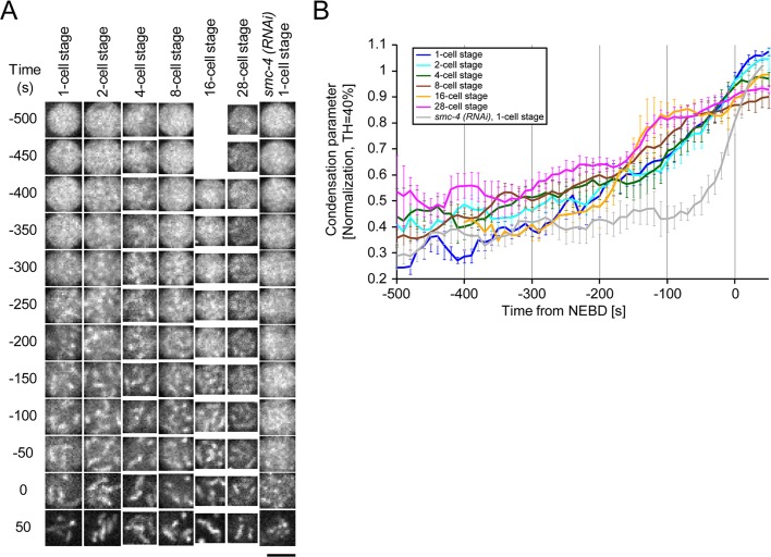 FIGURE 2:. Dynamics of chromosome condensation in various cell stages. (A) Representative nuclear images at various cell stages of a control embryo and one-cell-stage smc-4 (RNAi) embryo. Images are at 50-s intervals. Time corresponds to NEBD of 0. Bar, 5 μm. (B) Average of condensation parameter versus time. Colors indicate data from different cell stages of wild-type embryos (blue, 1-cell stage, male pronucleus, n = 6; light blue, 2-cell stage, n = 5; green, 4-cell stage, n = 7; brown, 8-cell stage, n = 8; yellow, 16-cell stage, n = 2; pink, 28-cell stage, n = 8) and one-cell-stage smc-4 (RNAi) embryos (gray, n = 5). The average condensation parameter was calculated after aligning the sequences to NEBD. Error bars are SE. The sudden increase in the condensation parameter in smc-4 (RNAi) around NEBD likely reflects the diffusion of free histones throughout the cytoplasm and might not reflect a change in chromosome condensation.