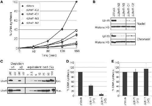 ???displayArticle.abstract??? UHRF1 (ubiquitin-like, containing PHD and RING finger domains 1) has a well-established role in epigenetic regulation through the recognition of various histone marks and interaction with chromatin-modifying proteins. However, its function in regulating cell cycle progression remains poorly understood and has been largely attributed to a role in transcriptional regulation. In this study we have used Xenopus laevis egg extracts to analyse Uhrf1 function in DNA replication in the absence of transcriptional influences. We demonstrate that removal of Uhrf1 inhibits chromosomal replication in this system. We further show that this requirement for Uhrf1, or an associated factor, occurs at an early stage of DNA replication and that the consequences of Uhrf1 depletion are not solely due to its role in loading Dnmt1 onto newly replicated DNA. We describe the pattern of Uhrf1 chromatin association before the initiation of DNA replication and show that this reflects functional requirements both before and after origin licensing. Our data demonstrate that the removal of Xenopus Uhrf1 influences the chromatin association of key replication proteins and reveal Uhrf1 as an important new factor required for metazoan DNA replication.
