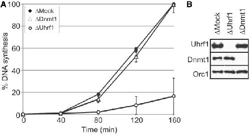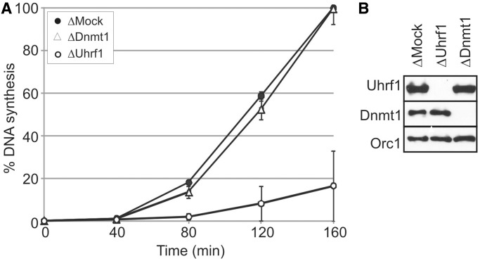 Figure 3. The Uhrf1-dependent replication defect does not reflect a requirement for Dnmt1 loading. (A) Mock-, Dnmt1- and Uhrf1-depleted extracts supplemented with sperm chromatin were incubated at 21°C, and DNA replication was measured by continuous incorporation of α-32PdCTP. Data from three independent experiments are presented. (B) Western blot indicating levels of Uhrf1 and Dnmt1 in depleted and mock-depleted extracts relative to Orc1 loading control.