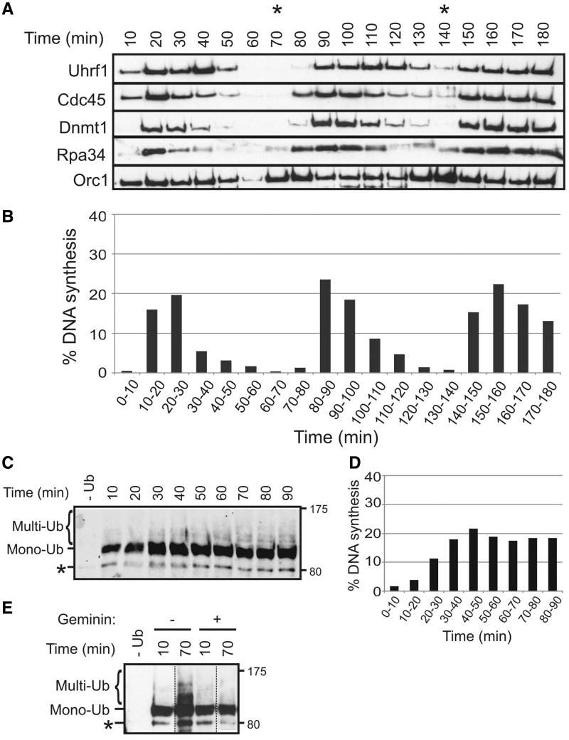 Figure 1. Uhrf1 associates with chromatin and undergoes ubiquitylation during DNA replication. (A) XB extract, without cycloheximide, was supplemented with sperm chromatin and incubated at 21°C. Chromatin was isolated at 10-min intervals and associated proteins were immunoblotted with the indicated antibodies. Orc1 serves as a loading control. The timing of mitosis is indicated by asterisk. (B) Pulse-label DNA replication assay performed alongside chromatin time-course in (A). (C) Egg extract (S buffer) was supplemented with recombinant His-ubiquitin (0.1 µg/µl) and sperm nuclei and incubated at 21°C. At the indicated times, samples were purified on nickel agarose and eluted proteins were immunoblotted with Uhrf1 antibody. (D) Pulse-label DNA replication assay associated with ubiquitylation time-course in (C). (E) His-Ub (0.1 µg/µl) and geminin (80 nM) were added to egg extract (S buffer) containing nuclei, as indicated. Samples were purified on nickel agarose after 10 min and 70 min and immunoblotted for Uhrf1. Dotted lines indicate removal of intervening lanes on the same gel for the sake of clarity. Probable monoubiquitylated Uhrf1 degradation product is indicated by asterisk.