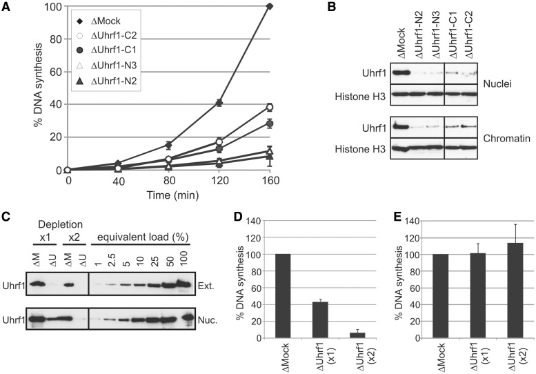 Figure 2. Uhrf1 is required for efficient DNA replication in Xenopus egg extract. (A) XB extract was subjected to two rounds of immunodepletion using sepharose beads cross-linked to either non-specific IgG (Mock) or to antibodies raised to the N-terminus (N2 and N3) or C-terminus (C1 and C2) of Uhrf1. DNA replication in each extract was measured by continuous incorporation of α-32PdCTP into sperm chromatin. (B) Western blot of Uhrf1 in nuclear and chromatin fractions after depletion with the indicated antibody beads. Histone H3 serves as a loading control. (C) Western blot comparing Uhrf1 levels in cytoplasmic extract and nuclei after one (×1) or two (×2) rounds of depletion with control beads (ΔM) or anti-Uhrf1-N2 antibody beads (ΔU), alongside dilution ranges of mock-depleted extract/nuclear fractions (where 100% is an equivalent load to ΔM ×1 depletion) (D) Replication of sperm DNA in XB extract after two rounds of depletion with control beads (ΔMock) or one (×1) or two (×2) rounds of depletion with anti-Uhrf1-N2 beads. (E) DNA synthesis on M13 ssDNA template in ΔMock and ΔUhrf1 extracts (one or two rounds of depletion, as indicated). In each case, the data represent three independent experiments and error bars indicate standard deviation (SD).
