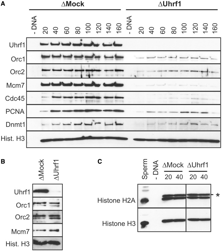 Figure 5. Uhrf1 is required for ORC chromatin loading. (A) Sperm chromatin was incubated in ΔMock or ΔUhrf1 extracts for the indicated times and chromatin association of replication proteins was analysed by immunoblotting. (B) Western blot to show levels of the indicated replication proteins in nuclei isolated from ΔMock or ΔUhrf1 extracts. (C) Sperm chromatin and chromatin isolated from ΔMock or ΔUhrf1 extracts was immunoblotted with antibodies against histone H2A and histone H3. Phosphorylated histone H2A is indicated by asterisk. Histone H3 serves as a loading control.